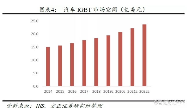 在汽车应用中,IGBT主要用在高电压环境的电力驱动系统,电源系统和充电桩。应用范围一般都在耐压600V 以上,电流 10A 以上,频率 1KHz 以上的区域。电力驱动系统:主要用在逆变器(DC-AC)中,将充电电池12V的直流(DC)电转换成为驱动电机220V的交流(AC)电,是电机驱动的核心。电机控制系统需要用到几十个IGBT,比如特斯拉的三相交流异步电机,每相用28个IGBT,累计84个,其他电机12个IGBT,特斯拉总共用到96个IGBT。电源系统:主要用在车载充电器(AC-DC)和变换器(DC-DC)中,实现锂电池充电和所需电压等级的电源变换。充电桩:电网的电都是交流(AC)电,而充电桩分类快充的直流充电桩和慢充的交流充电桩,IGBT主要用在直流快充的充电桩。2018年全球汽车IGBT市场容量18.4亿美元,我们预计2020年汽车IGBT市场容量20.8亿美元。