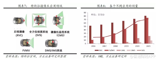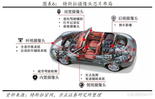 2、摄像头CIS是特斯拉的“眼睛”。数量上,倒车后视,环视,前视,转弯盲区等Level3以上的辅助驾驶需要18颗摄像头。单功能上LFM防闪烁,低光可靠性,HDR宽动态对像素也提出要求,纯800万像素的摄像头就需要5颗。