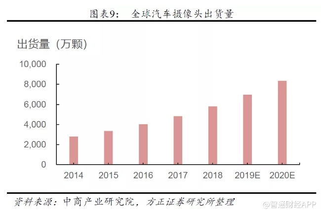 据中商产业研究院预测,全球车载摄像头出货量预计会从2014年的2800万颗增加到2020年的8270万颗。如今多数国家都在制定相应法规,强制新车使用一些特殊的ADAS技术,而车载摄像头在汽车智能化中应用广泛,未来将会成为使用最多的汽车传感器。