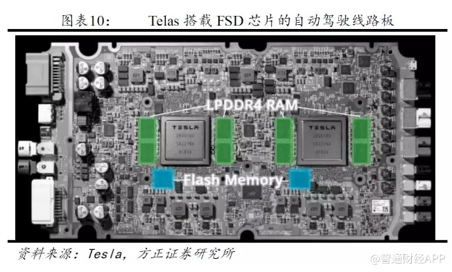 Tesla公布的搭载两颗FSD芯片的自动驾驶线路板中,图中蓝色区域为用于存储操作系统的内存颗粒。考虑到未来迈向更高层次的自动驾驶技术,承载深度学习模型未来可不断升级的内存颗粒向大容量方向趋势明显。 处理器模块两旁绿色是各自 4 片,一共 8 片 LPDDR4 运行内存颗粒,FSD线路板内建LPDDR4 RAM存储器模块以每秒4,266Gb速度运行,峰值频宽达68GB/s,使整合的影像信号处理器每秒可执行高达10亿级像素的操作。
