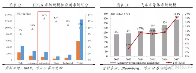 汽车半导体389亿市场规模,FPGA目前仅占2.4%,自动驾驶发展将提高FPGA和ASIC价值占比。汽车主控芯片包括GPU、FPGA、ASIC等,FPGA目前在相机和传感器中的应用已经相对成熟,未来在ADAS/AD系统、马达控制、激光雷达、车载信息娱乐系统和驾驶员信息系统均有较多应用。根据Bloomberg数据,汽车半导体市场规模2017年达到388.6亿美元,其中FPGA为9.5亿美元,占比仅2.44%,提升空间巨大。