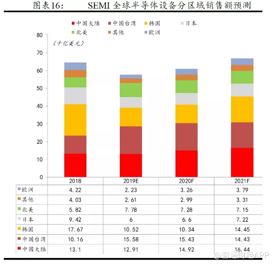 汽车尤其是电动汽车正逐渐从一个机械产品演变成电子产品,其核心能力不再是发动机,底盘和动力传输系统,而是芯片和软件。电动汽车电子装置含硅量不断提升,利好产业支撑环节半导体设备。 5G+AIOT+汽车电子驱动全球半导体设备进入新一轮上行周期。中国大陆承接半导体制造产能重心,中国大陆设备市场的全球占比持续提升,2021年有望达到世界之首。2019年Q2起大陆自主晶圆厂进入投产高峰期,未来三年半导体设备需求迎来爆发式增长。根据2017年至今大陆自主晶圆厂开工以及投产情况统计,测算未来19-22年半导体设备累计总投资在700亿美元左右,同比2018年120亿美元有很大增长空间,晶圆厂本身扩产有降本的采购需求,有利于国产化率的提升,2018年国产化率不到15%,提升空间巨大。建议关注国内半导体设备龙头。