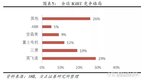 全球IGBT市场中英飞凌,三菱和富士电机处于领先位置,安森美(ON.US)主要集中在低压的消费电子行业,电压在600V以下,而中高压1700V以上领域,主要应用在高铁,汽车,智能电网等,基本被英飞凌,ABB(ABB,US)和三菱垄断。