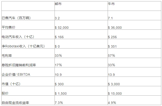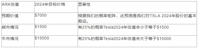 根据我们对电动汽车(EV)成本下降和需求的最新预期,以及对robotaxis潜在盈利能力的估计,我们对2024年TSLA的每股期望值为7,000美元(10倍空间)。为了得出该基本情况,ARK开发了使用熊市和牛市价格估算的概率分析,如下所示: