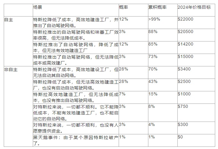 ARK的估值基于10个场景,每个场景都经过概率加权。对于特斯拉,我们的牛市案例并未假设上述三个变量的输入最为激进。相反,我们估计每个自变量的概率,从而得出8个场景。我们还提供了两种情况,其中包括最坏的情况:1)特斯拉无法进入资本市场,降低成本,启动自动出租车网络并提高资本效率的可能性为3%;2)特斯拉破产的黑天鹅事件。