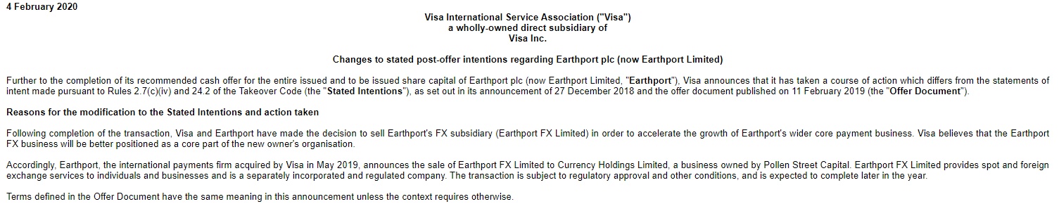 据悉,Earthport是Visa在2019年5月份收购的国际支付公司。昨日,Visa在提交给伦敦证交所的文件中称,Earthport的外汇业务将更好地定位为新东家组织的核心部分。