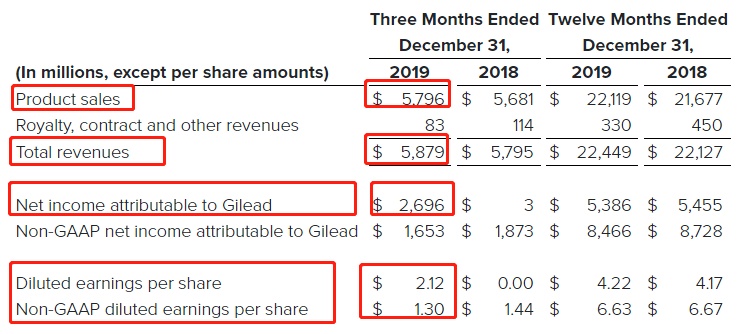 吉利德预计,2020年,公司产品总销售额达218-222亿美元,摊薄每股收益在5.15-5.55美元之间;非GAAP摊薄每股收益在6.05-6.45美元之间。