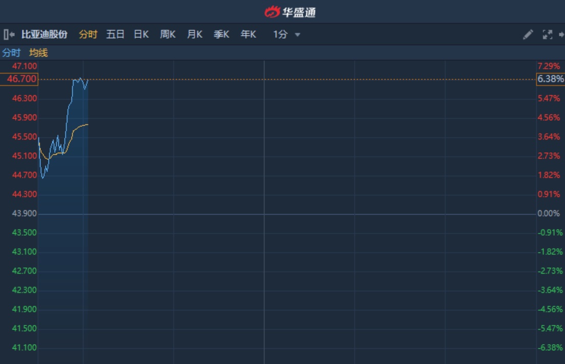 智通财经APP获悉,比亚迪股份(01211)延续涨势,获花旗上调目标价6.6%至80港元,维持“买入”评级,截至10时02分,涨6.38%,报价46.7港元,成交额2.24亿。值得注意的是,该股暂现三连阳,累计涨幅超13%。