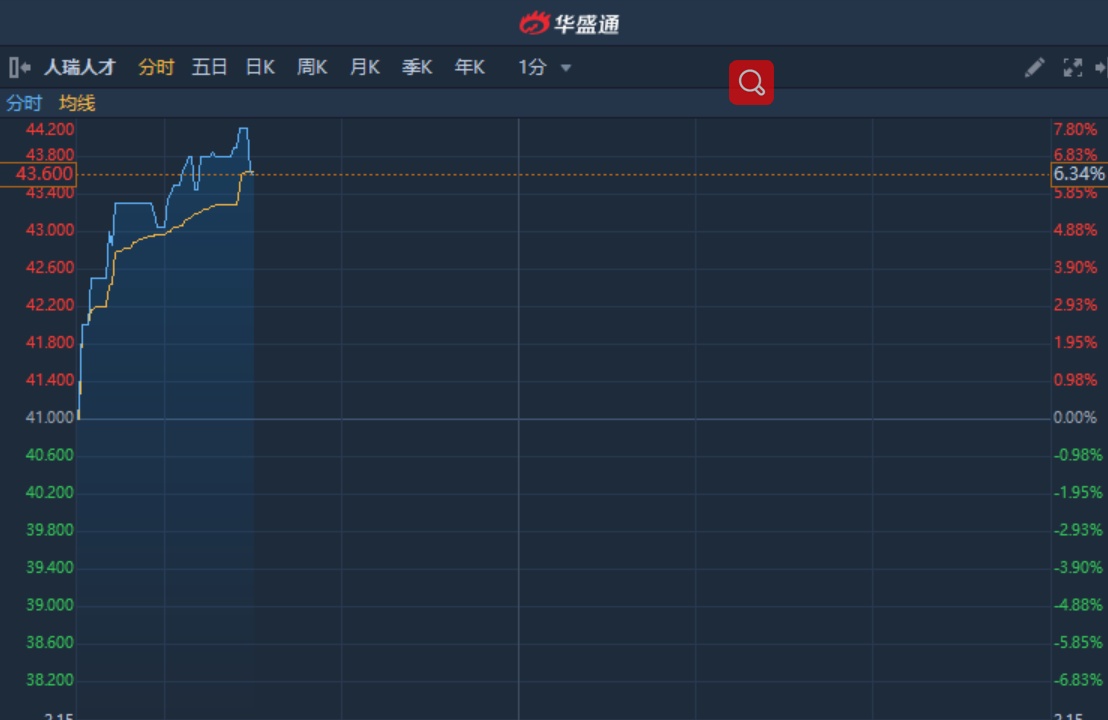 智通财经APP获悉,人瑞人才(06919)获西南证券首予“买入”,目标价看高至58港元。盘中一度高见44.1港元,刷新上市新高。截至10时29分,涨6.34%,报价43.6港元,成交额454万。