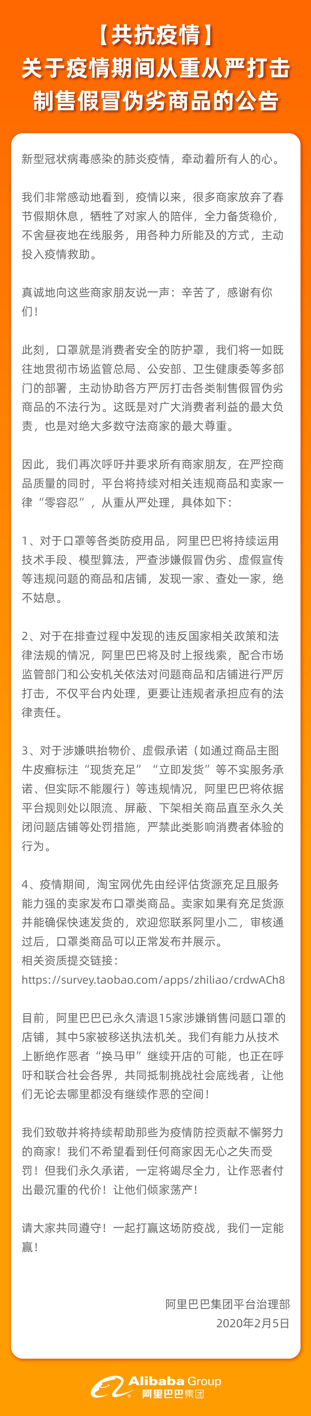 截至2月4日,阿里巴巴已永久清退15家涉嫌销售问题口罩的店铺,其中5家被移送执法机关。