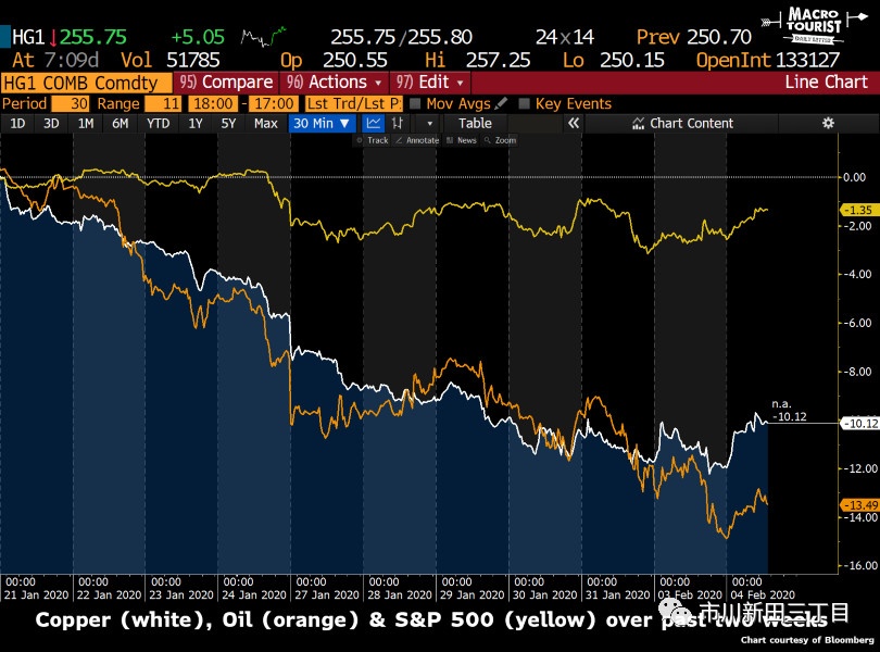 看看下图中有色金属铜,原油和标准普尔500指数的走势。