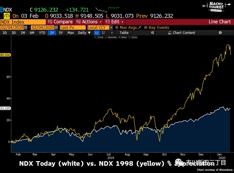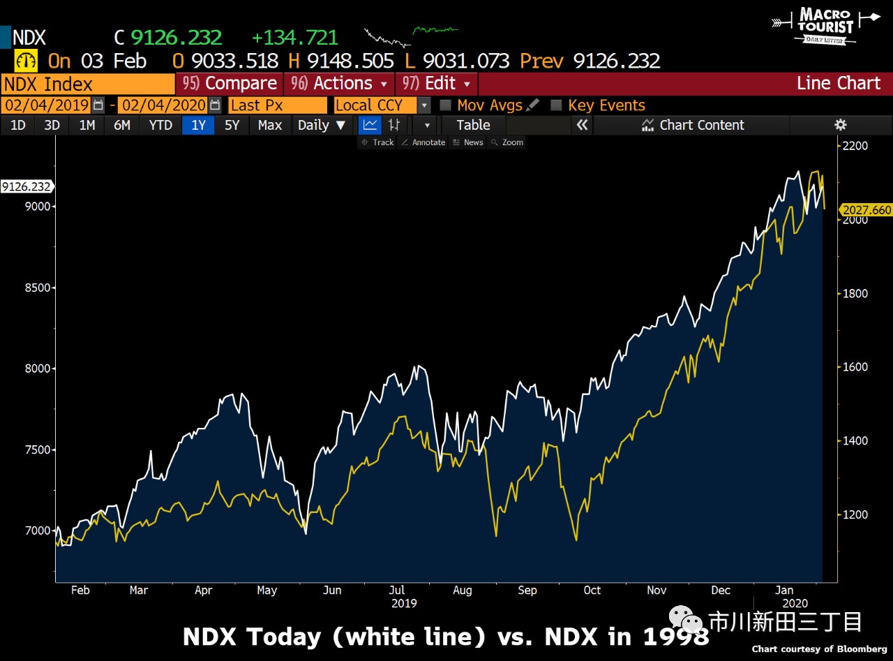 我看到很多人都在拿当前的市场走势与高科技股泡沫那会儿做对比,比如下面这张图,图中白线为最近一年纳斯达克指数的走势,黄线为1998年的走势: