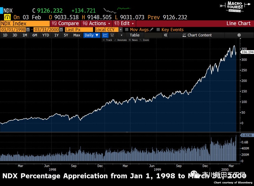 1998年纳斯达克指数涨了差不多一倍,然后在1999年又翻了一番。