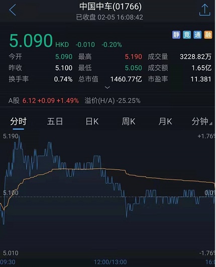 截至今日收盘,中国中车跌0.2%,报5.09港元。