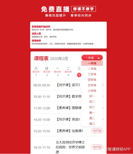 在免费直播课方面,学而思已于2月1日起安排全天试运行授课,并将于2月10日起推出从周一到周五与校内时间同步的全年级各学科免费直播课和自学课。