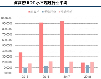 海底捞目前是火锅行业当中的绝对龙头,市占率还在不断提升。智通财经APP了解到,作为火锅及中式餐饮企业的绝对龙头,凭借供应链和全产业链布局、独特的管理制度以及强大的品牌及规模效应三大优势,海底捞已经构建较深的护城河。2015-2017年,海底捞整体ROE水平大幅领先餐饮行业平均水平,2016和2017年ROE水平均超过90%,2018年则因大量新店开业所致导致ROE有所下降。经专业人士测试,海底捞新店开业的一次性投入成本回收期约10-11个月,考虑新店开业的一次性成本等因素,新店开业基本可以保证在一年内贡献净利润。投资回收期短,使得海底捞即使在大规模开店的情况下,也能快速实现盈利。