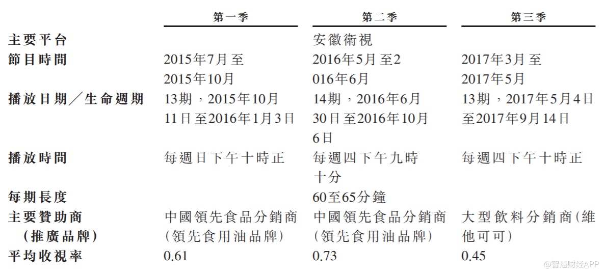 煜盛文化在招股书中也提到,公司从数目有限的节目获取绝大部分收入,如这些节目有任何延迟播出、取消或提早终止参与,均可能会对公司的业务、财务状况及经营业绩造成重大不利影响。