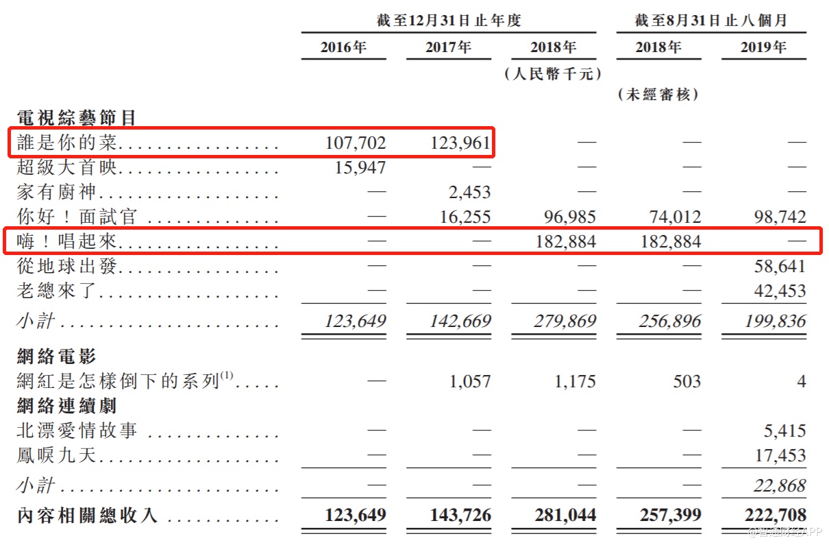 其中,《谁是你的菜》在2016-2017年两年内共为煜盛文化贡献2.32亿元收入,为公司当时主要的收入来源,2018年则由《嗨!唱起来》接棒。