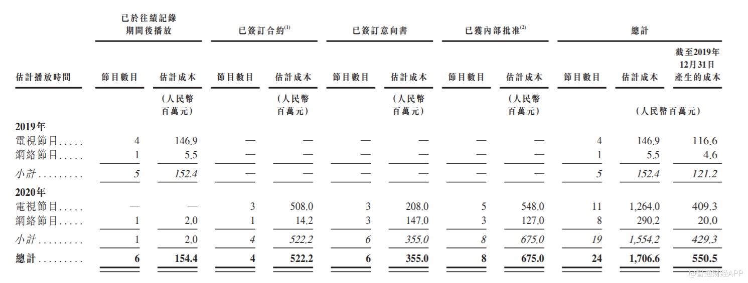 煜盛文化预期于2020年发布19套节目,估计总成本为15.54亿元人民币,截止2019年12月31日这19套节目产生的成本为4.29亿元,这意味着今年是煜盛文化资本支出的大年,资金需求比2019年大得多。