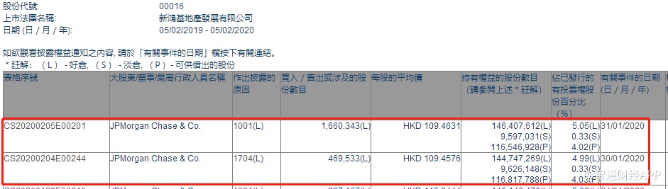 智通财经APP获悉,联交所最新资料显示,1月30日,摩根大通减持新地(00016)47万股,每股作价109.4576港元,总金额约为5144.5万港元。1月31日,摩根大通增持新地166万股,每股作价109.4576港元,总金额约为1.82亿港元。增持后最新持股数目约为1.46亿股,最新持股比例为5.05%。