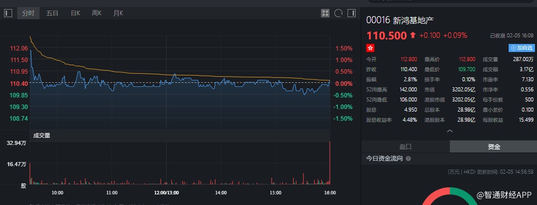 截至今日收盘,新地(00016)涨0.09%,报110.50港元。