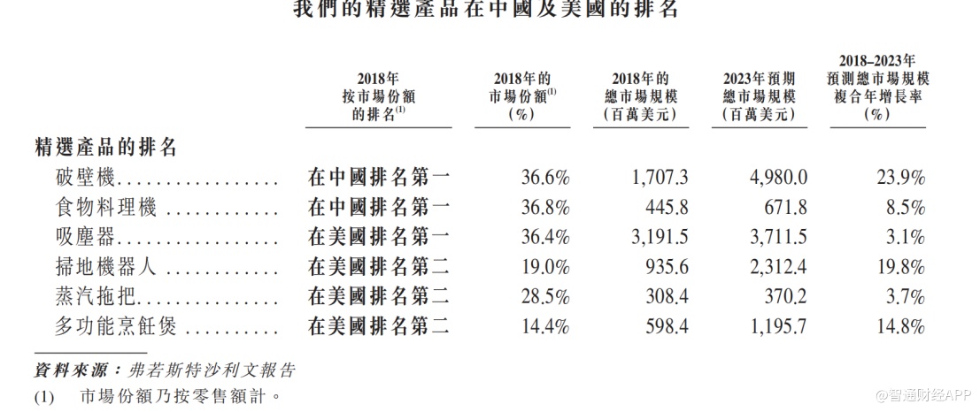 不过,中国吸尘器市场的发展却十分迅速。弗若斯特沙利文报告显示,按零售额计,2018年,吸尘器及扫地机器人的市场规模分别为18亿美元及12亿美元。吸尘器及扫地机器人的增长是2014年至2018年期间家居环境电器整体增长的主要推动力。由于消费普遍升级及市场逐渐认可该等产品带来的极大便利性,以及正面的使用者体验,2018年至2023年,吸尘器及扫地机器人预计将分别以25.2%及30.8%的复合年增长率增长。
