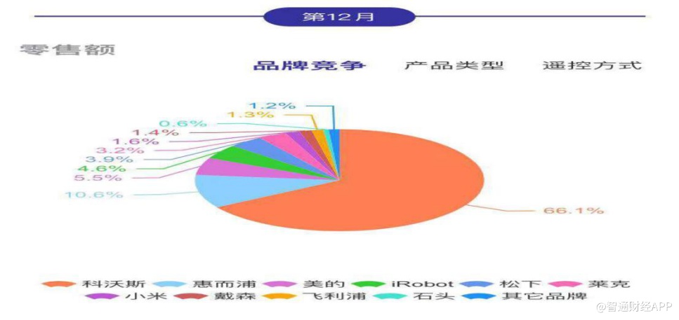 中怡康近期公布的数据显示,12月科沃斯扫地机器人线下销售额市占率达到66.1%,远远领先iRobot、松下、戴森、飞利浦等国际大牌。