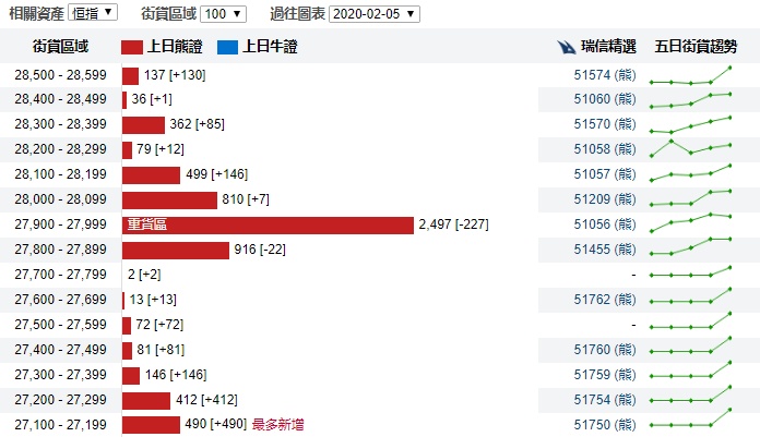 瑞信恒指牛熊证街货分布图中的数据显示,熊证街货重货区在27900-27999区间,该区间最新熊证数量为2497张,较上一交易日减少227张。最多新增在27100-27199区间,该区间最新熊证数量为490张,较上一交易日增加490张。
