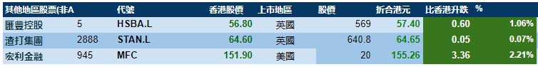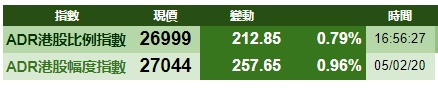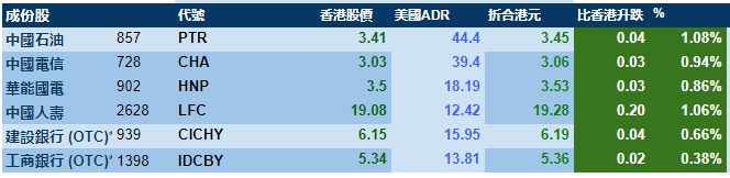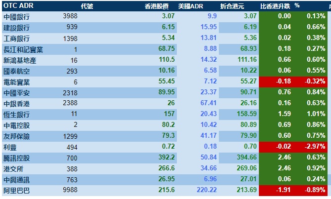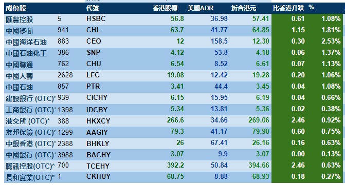 智通财经APP获悉,周三,美股大幅收涨,港股ADR指数上涨,按比例计算,收报26999点,涨212.85点或0.79%。大型蓝筹全线收涨,汇丰控股(00005)收报57.41港元,较港收市涨0.61港元;腾讯控股(00700)收报394.66港元,较港收市涨2.46港元。内银股小涨,建设银行(00939)收报6.19港元,较港收市涨0.04;工商银行(01398)收报5.36港元,较港收市涨0.02港元。
