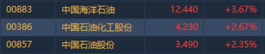 智通财经APP获悉,国际油价集体走高,刺激港股石油板块全线上扬,中海油(00883)暂领涨蓝筹。截至9时40分,中海油涨3.67%,报价12.44港元,中石化(00386)涨2.67%,中石油(00857)涨2.35%。