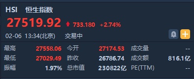 消息刺激恒指涨幅扩大逾700点。截至发稿,恒指涨726.42点或2.71%,报27513.16点,大市成交额826.59亿港元。