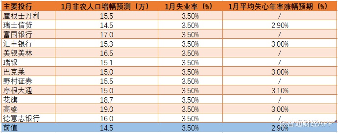 智通财经APP整理出了12家大型投行的非农预测,整体来看,各投行对美国1月非农就业人口增幅预测介于14.5万-19万之间,失业率预测维持在3.5%,平均时薪年率增幅预测介于2.9%-3.1%之间。