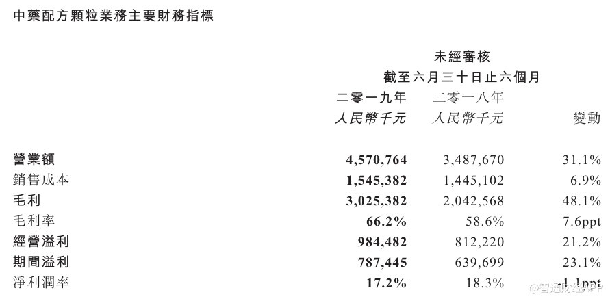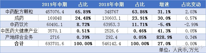 为何说不愁吃喝?智通财经APP看到,2019年中期,中国中药中药配方颗粒依旧仍为公司销售业绩的顶梁柱,且依赖程度较去年进一步加深。期内,中药配方颗粒业务为公司贡献营业额约45.71亿元,占总营业额比重65.89%,同比增速31.1%。