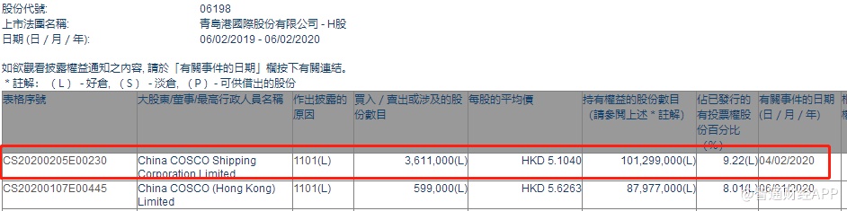 智通财经APP获悉,联交所最新资料显示,2月4日,China COSCO Shipping Corporation增持青岛港(06198)361.1万股,每股作价5.104港元,总金额约为1843.05万港元。增持后最新持股数目约为1.01亿股,最新持股比例为9.22%。