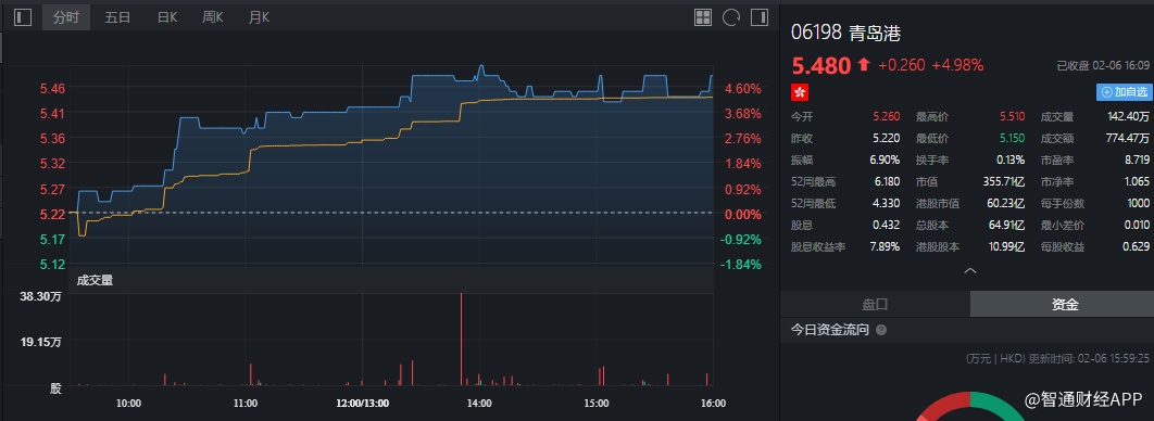 截至今日收盘,青岛港(06198)涨4.98%,报5.48港元。