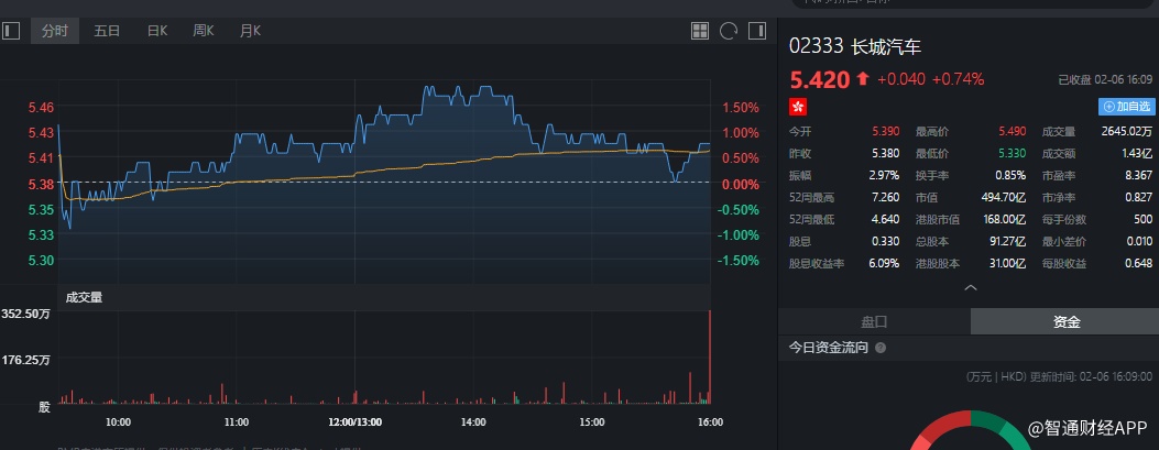 截至今日收盘,长城汽车(02333)涨0.74%,报5.42港元。