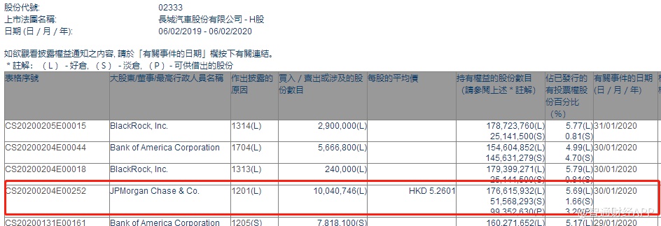 智通财经APP获悉,联交所最新资料显示,1月30日,摩根大通减持长城汽车(02333)1004.07万股,每股作价5.26港元,总金额约为5281.41万港元。减持后最新持股数目约为1.77亿股,最新持股比例为5.69%。