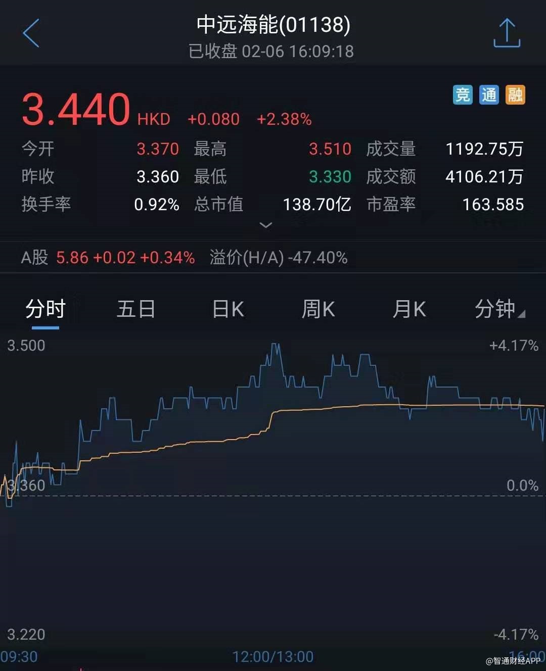 截至今日发稿,中远海能涨2.38%,报3.44港元。