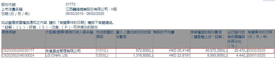 智通财经APP获悉,联交所最新资料显示,2020年2月3日,朱雀基金增持赣锋锂业(01772)97.26万股,每股作价20.4146港元,总金额约为1985.52万港元。增持后最新持股数目约为4097.22万股,最新持股比例为20.47%。