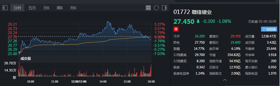 截至今日收盘,赣锋锂业跌1.08%,报27.45港元。