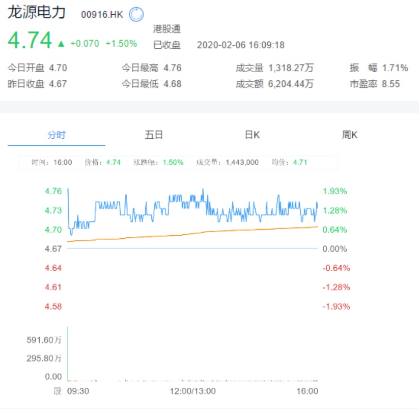 截至今日收盘,龙源电力涨1.5%,报4.74港元。