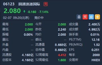 智通财经APP获悉,圆通速递国际(06123)发布公告,与2018年相应期间相比,预期集团于截至2019年12月31日止年度的收益将取得跌幅及纯利将大幅减少。该股早盘低开,截至发稿,跌7.14%,报2.08港元,成交额4.99万港元。值得一提的是,该股昨日大幅上扬,收涨27.27%。
