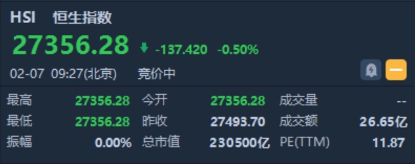 智通财经APP获悉,恒生指数开盘跌137.42点或0.5%,报27356.28点。国企指数跌0.82%,报10676.14点。红筹指数跌0.44%,报4350.25点。大市盘前成交26.66亿港元。