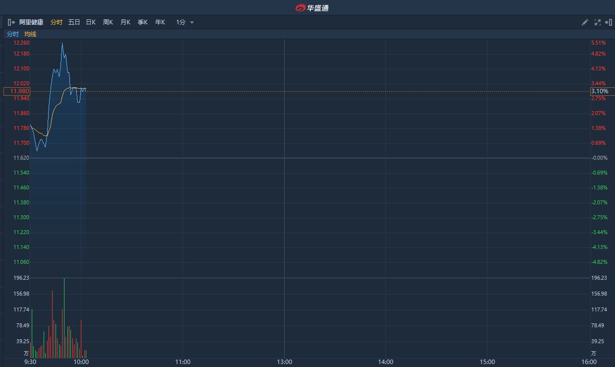 智通财经APP获悉,阿里健康(00241)发布公告,公司拟收购天猫医疗电商服务。总对价为80.75亿港元。并将透过公司在交割时向卖方发行8.6亿股对价股份支付对价。该股盘中一度涨逾5%,创近四年半新高。截至发稿,涨3.27%,报12港元,成交额2.29亿港元。