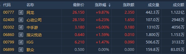 截至发稿,网龙(00777)涨14.71%,报27.3港元;金山软件(03888)涨7.77%,报28.45港元;中手游(00302)涨5%,报3.15港元;心动公司(02400)涨4.34%,报27.65港元。