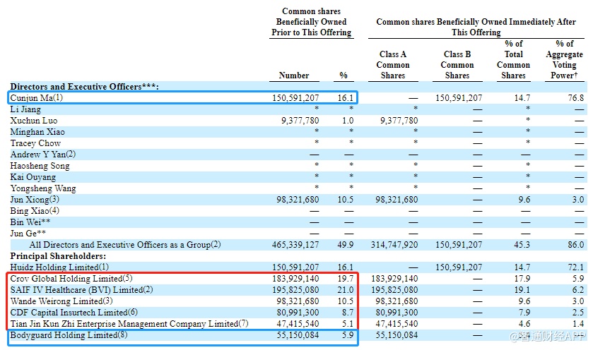 最新公布招股书中,慧择创始人兼CEO马存军通过Huidz Holding Limited直接持有公司16.1%的股份,A股上市公司焦点科技通过Crov Global Holding Limited持有19.7%的股份,而持有公司5.9%股份的Bodyguard Holding Limited则为慧择的员工激励平台。