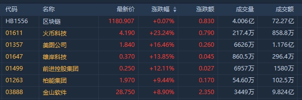截至发稿,火币科技(01611)涨23.24%,报4.19港元;美图公司(01357)涨16.46%,报1.84港元;雄岸科技(01647)涨12.31%,报0.365港元;前进控股集团(01499)涨12.11%,报0.25港元。