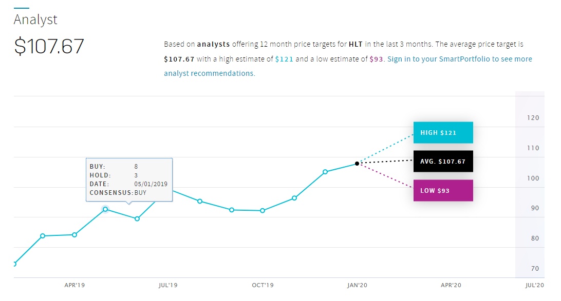 基于过去三个月内10位包括富国和摩根士丹利的分析师给出的建议,希尔顿全球控股的平均评级为“买入”,平均目标价为107.67美元。最高目标价为121美元,最低目标价为93美元。