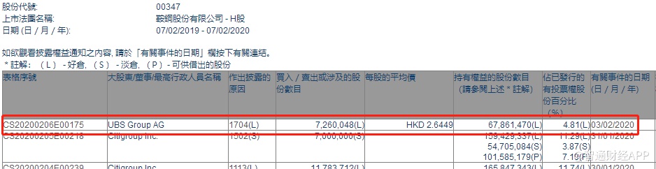 智通财经APP获悉,联交所最新资料显示,2月3日,瑞银减持鞍钢股份(00347)726万股,每股作价2.6449港元,总金额约为1920.20万港元。减持后最新持股数目约为6786.15万股,最新持股比例为4.81%。