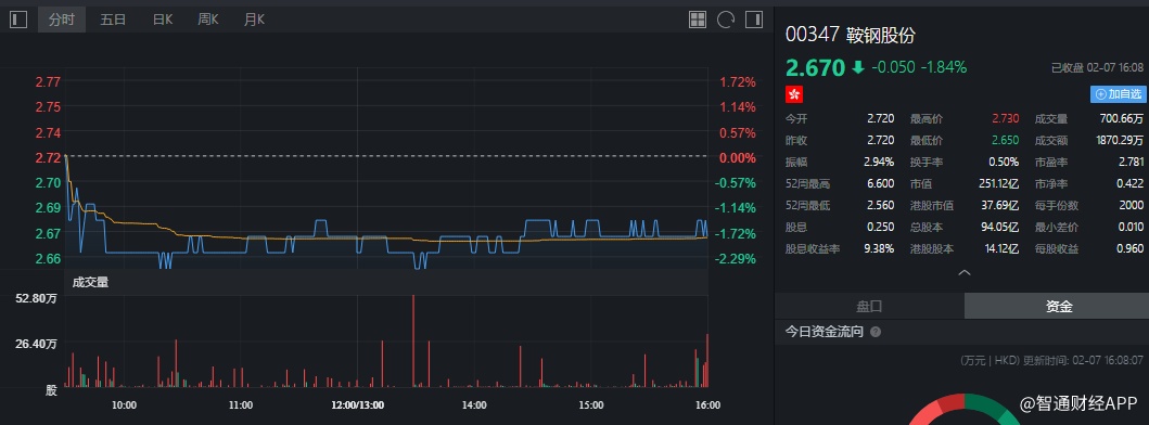 截至今日收盘,鞍钢股份(00347)跌1.84%,报2.67港元。